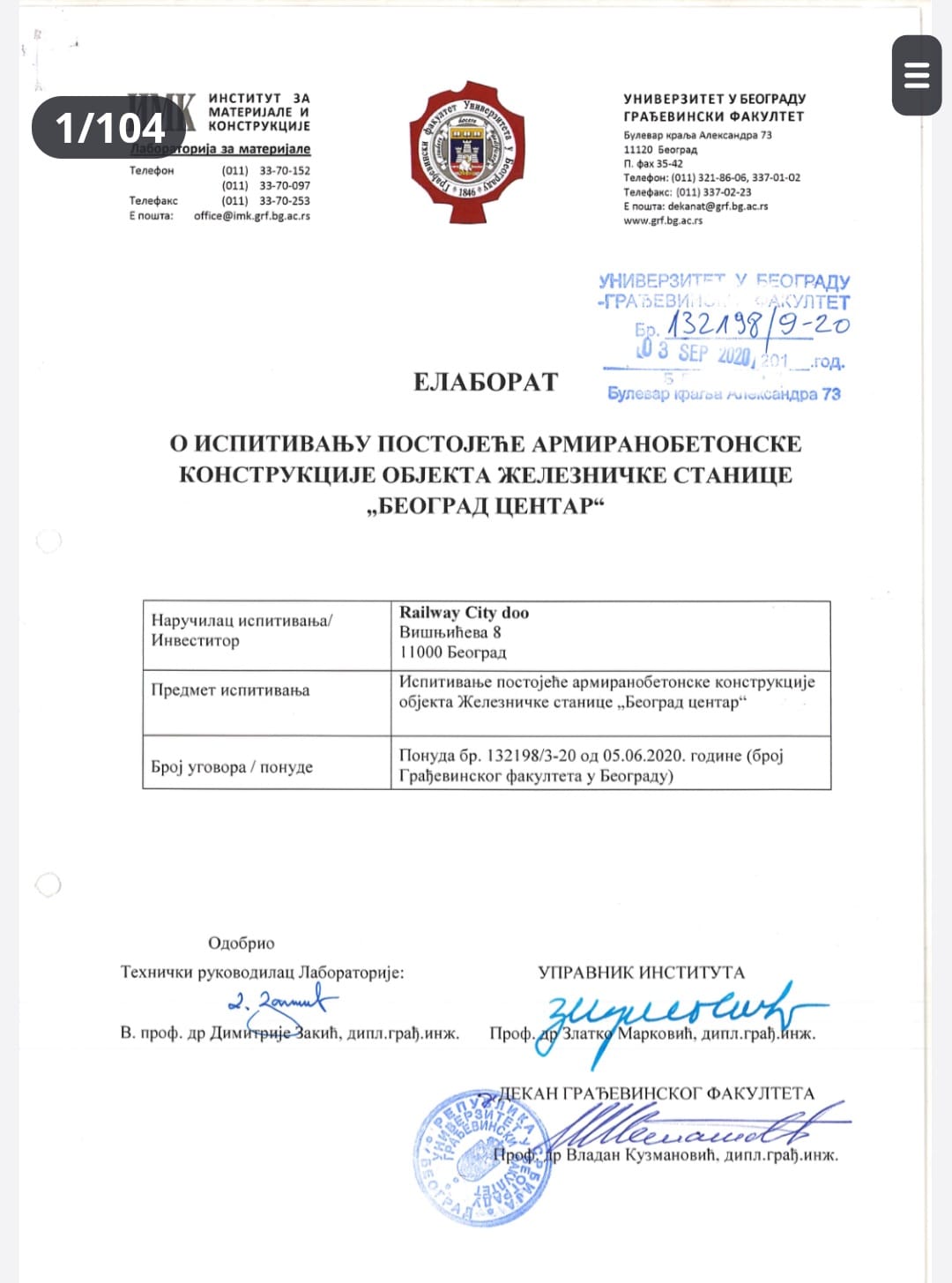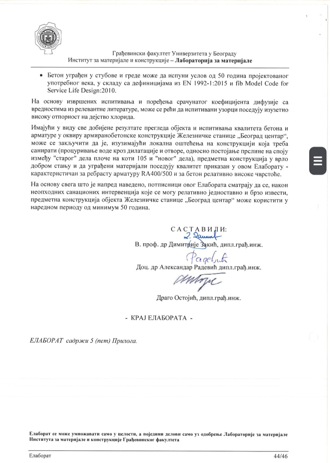 Постојећу армиранобетонску конструкцију објекта железничке станице Београд Центар испитивали су стручњаци Грађевинског факултета Универзитета у Београду Института за материјале и конструкције – Лабораторија за материјале, који су урадили одговарајући Елаборат о наведеном испитивању. Дакле, референтне, стручне и професионалне институције и стручњаци, у складу са Законом о планирању и изградњи, израдили су Техничку документацију, под називом „Елаборат о испитивању постојеће армиранобетонске конструкције објекта железничке станице Београд Центар“.