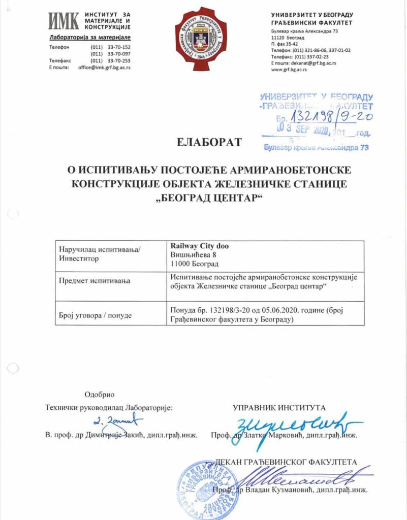 Елаборат о испитивању постојеће армиранобетонске конструкције објекта железничке станице “Београд Центар” радио је Институт за материјале и конструкције Грађевинског факултета Универзитета у Београду.